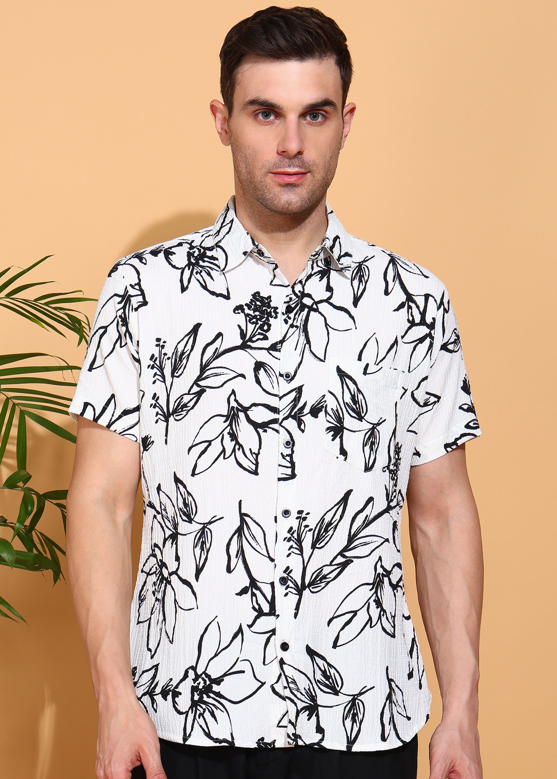 Yash Gallery Men’s Moss Bubble Fabric Short Sleeve Button-Down with Black Floral Print Casual Shirt