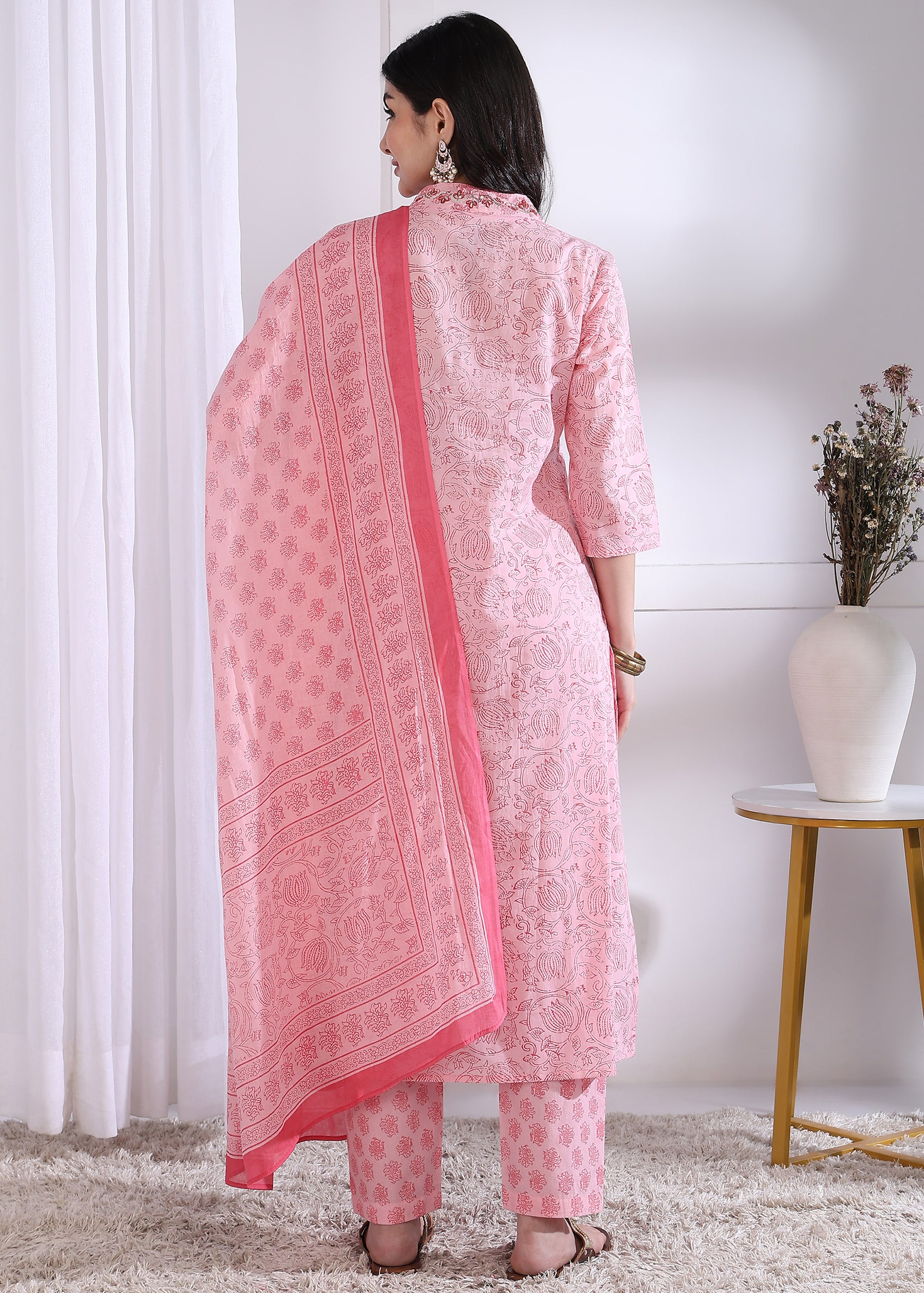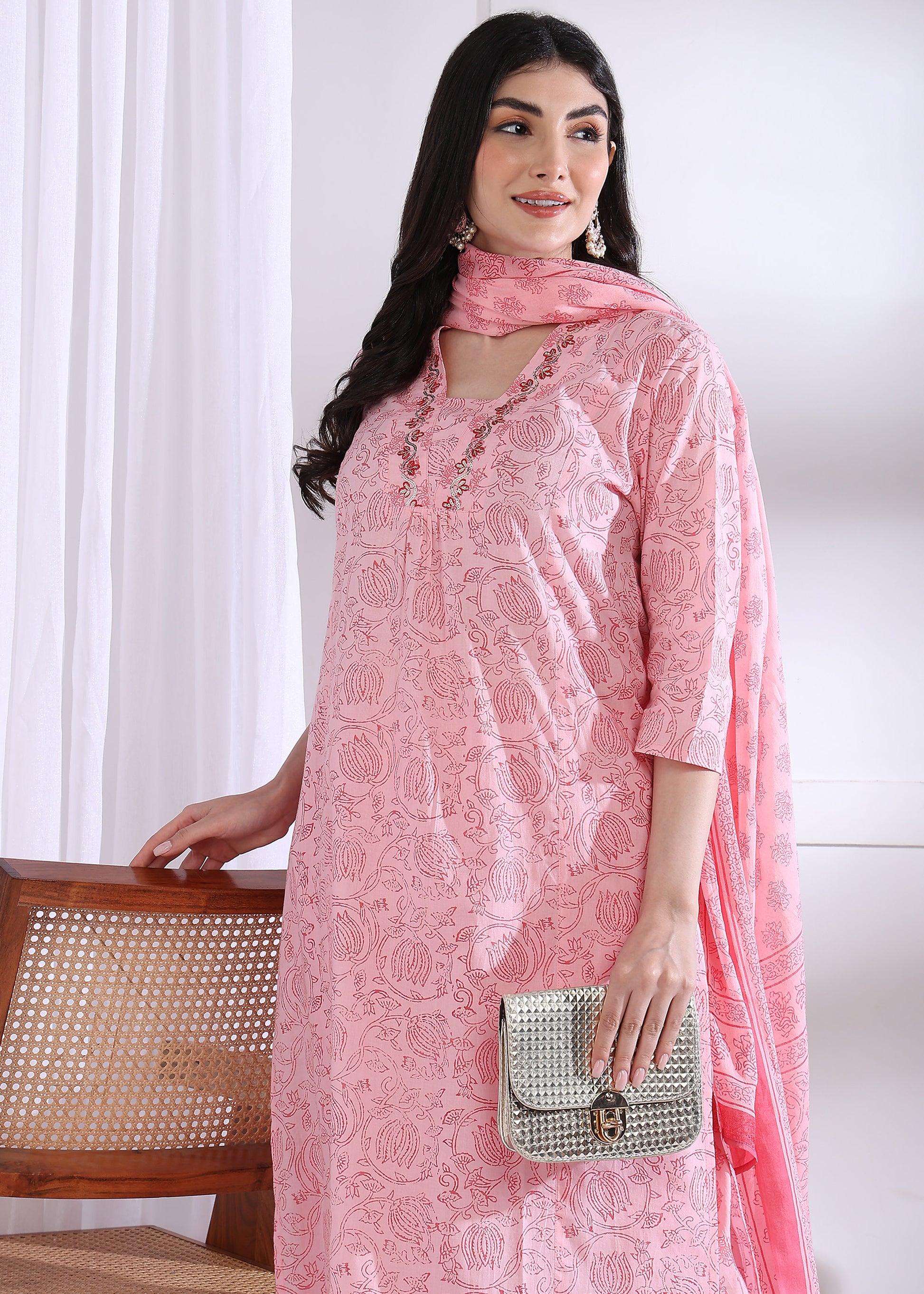 Yash Gallery Women’s Cambric Cotton Printed Straight Kurta with Pants & Dupatta Set (Pink)