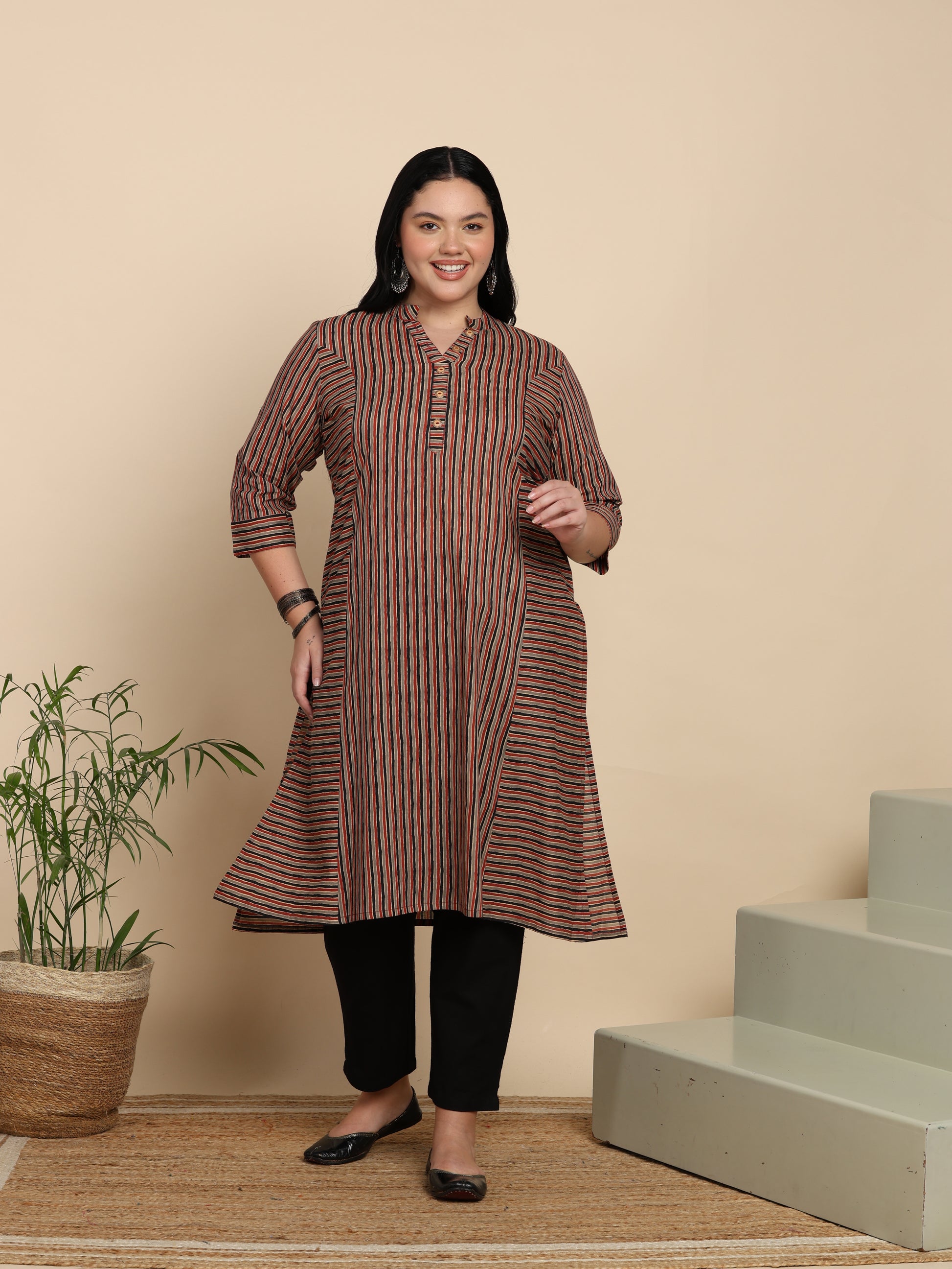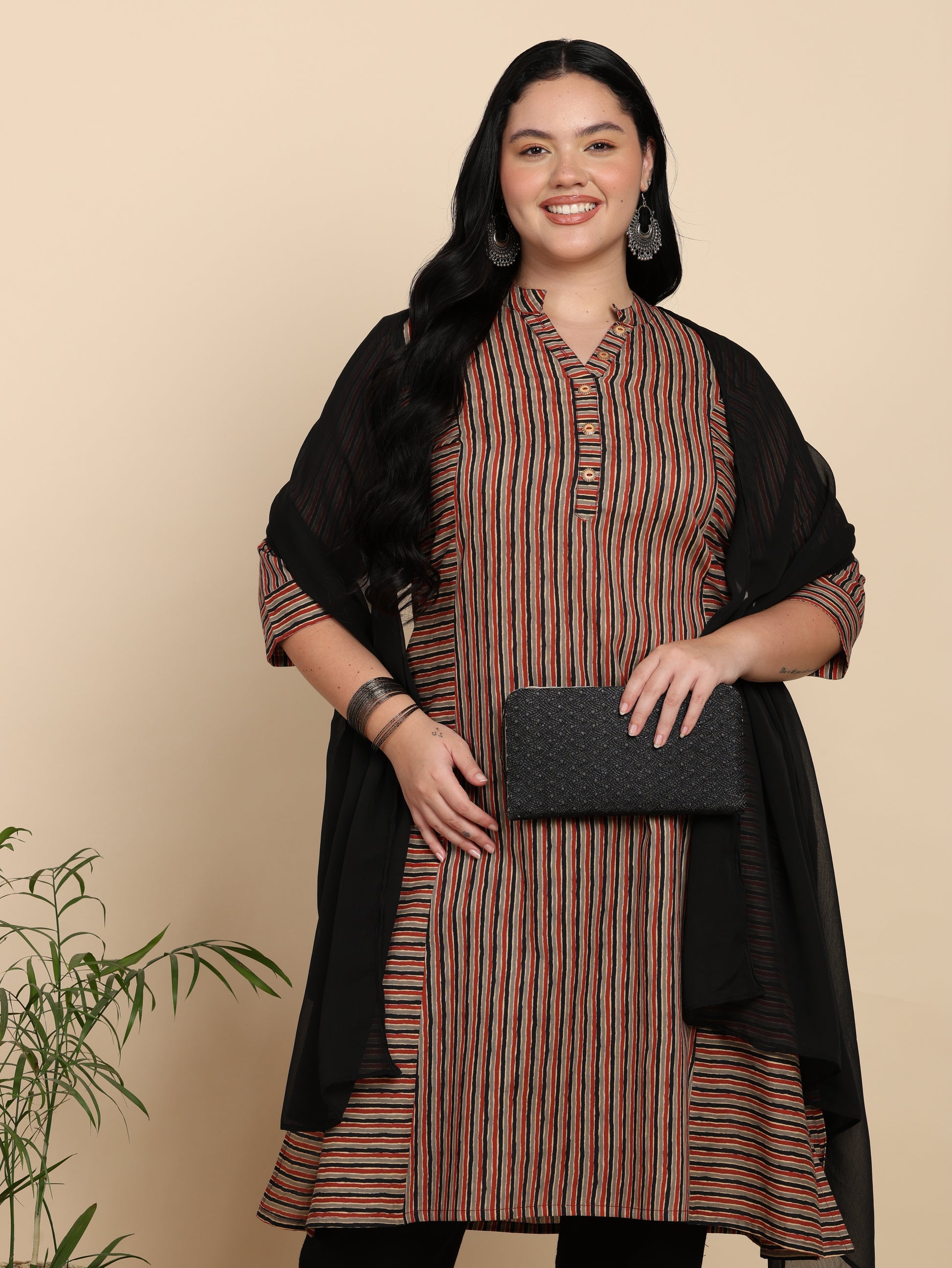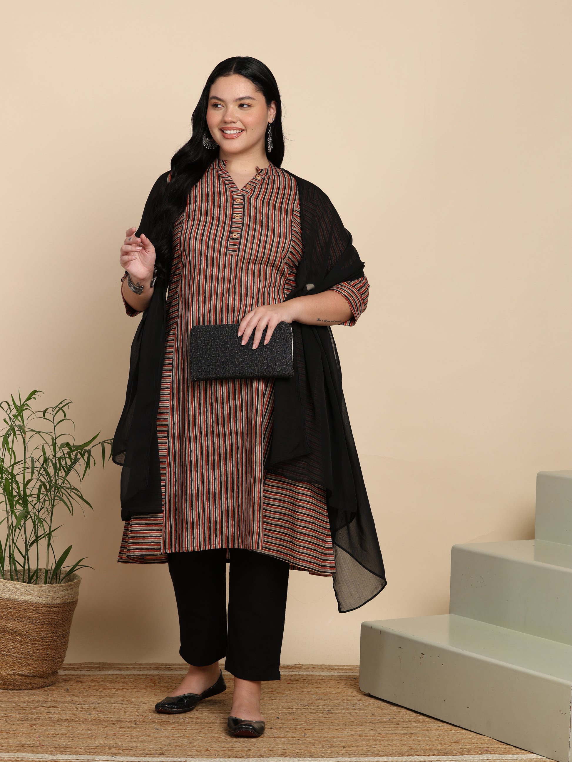 Yash Gallery Women’s Cotton Multi Striped Printed Straight Kurta with Pant & Dupatta