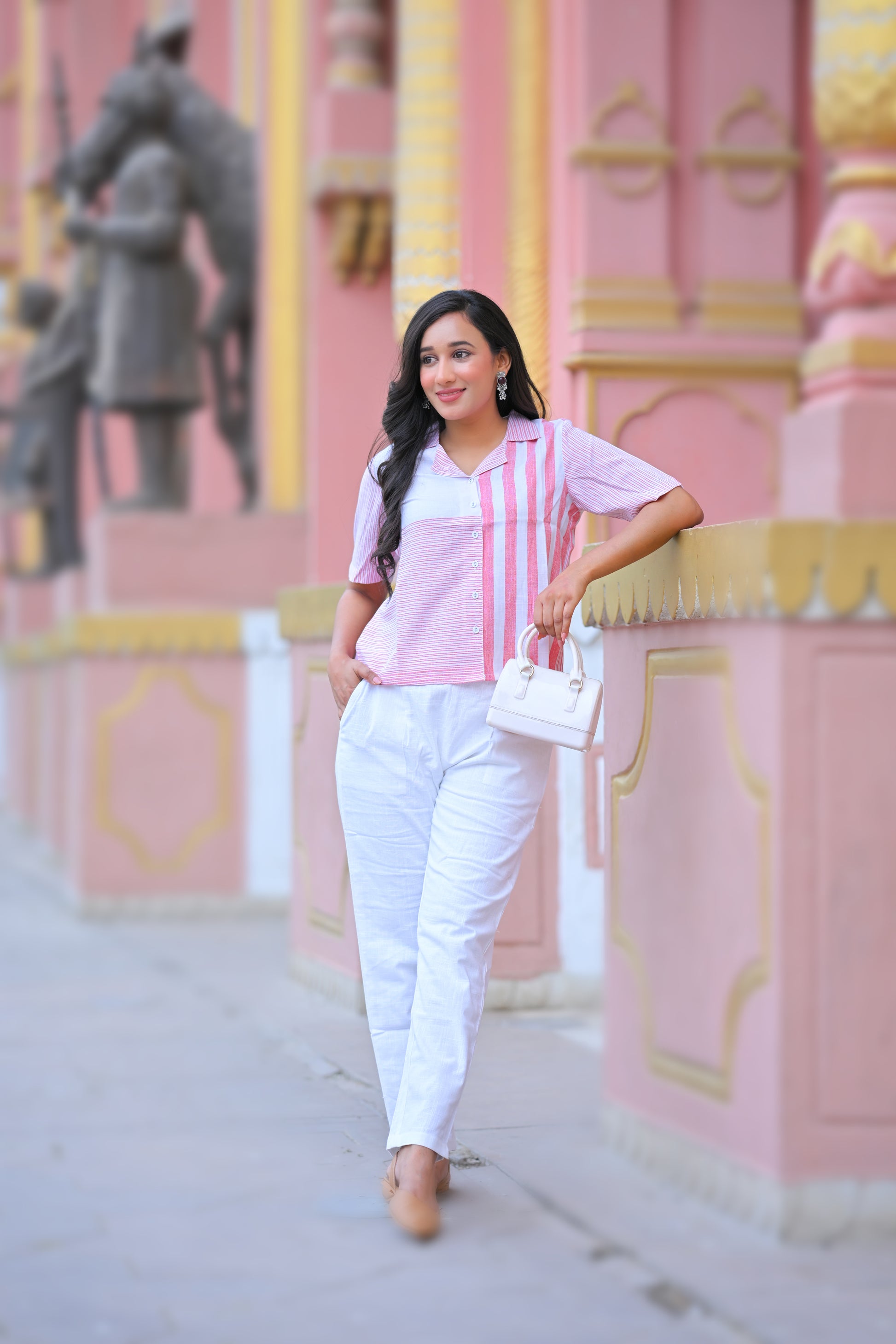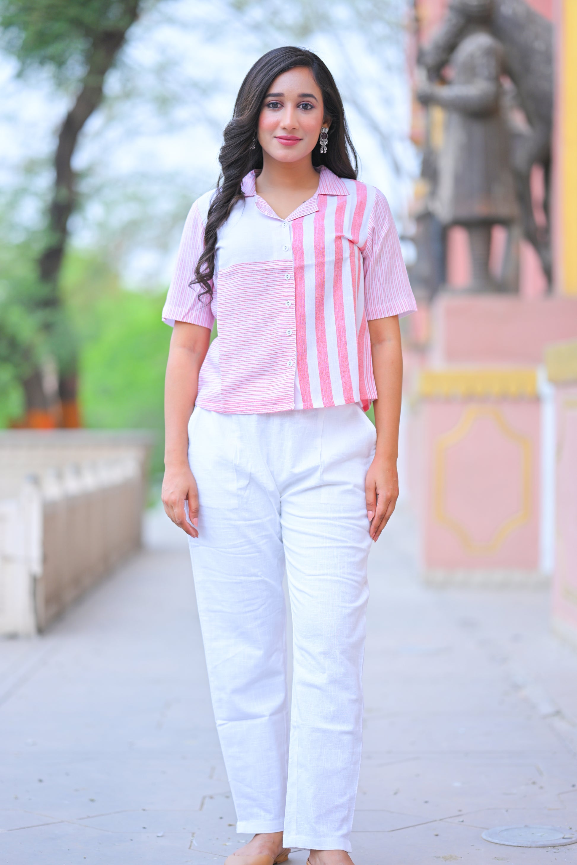 Yash Gallery Women’s Poly Viscose Striped Shirt Top Short Sleeve (White)