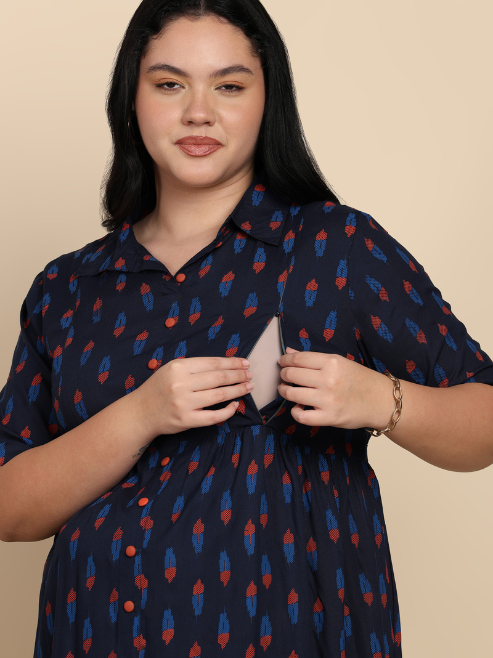 Embrace motherhood in style with the Yash Gallery Cotton Maternity Dress – thoughtfully designed for both comfort and elegance. Made from 100% breathable cotton, this dress keeps you relaxed throughout your pregnancy journey. The empire waistline with gathers gives ample room for your growing bump.The maroon ethnic block print, shirt collar design, and short sleeves make it perfect for daily wear, work, or casual outings. Whether you’re in your pregnancy months or in the nursing phase, this dress is a versatile addition to your wardrobe.