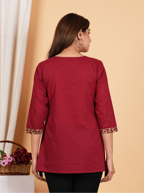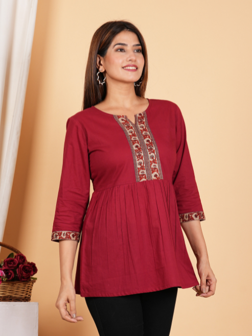Elevate your wardrobe with the Yash Gallery Women's Cotton Waist Length Top, beautifully crafted from soft, breathable cotton that offers comfort and style in equal measure. Featuring a chic maroon color, this top showcase a stunning Kalamkari print that adds an artistic touch, making it perfect for both casual outings and festive gatherings. With its flattering 3/4th sleeves and stylish knotch neck, this piece offers a regular fitted silhouette that accentuates your figure while allowing for ease of movement. Designed for versatility, this top is ideal for pairing with your favorite jeans, skirts, or even layered under a jacket for a trendy look. It seamlessly transitions from day to night, making it a must-have staple in your wardrobe. When it comes to care, simply machine wash in cold water and hang to dry to maintain its vibrant hue and detailed print, ensuring longevity and freshness for all your style adventures. Wearing this Kalamkari print top is not just about fashion—it's about embracing a story, a tradition, and a piece of art that is as unique as you are. Treat yourself or surprise a loved one with this exquisite addition to their collection!