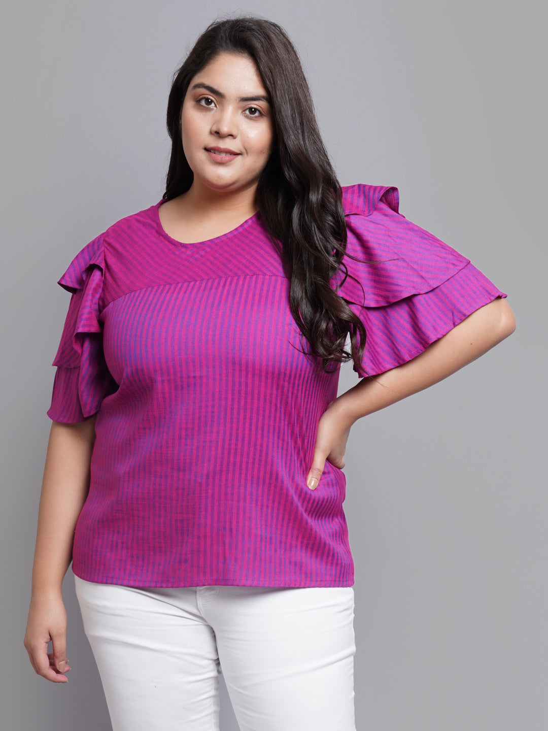 An amazing range of women's Tops in soft and solid colors that looks perfect for regular wear. With beautiful designs and patterns. These apparels are very stylish and comfortable too. Get rid of the 'regular' look this season wearing a Top by YASH GALLERY. With a perfect blend of comfort and traditional style, This Pink Stripe Printed Casual Top from YASH GALLERY exhibits Round Neck & 3 Layered Half Sleevss. Tailored from Viscose. Length: 25 Inches.